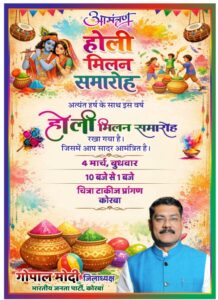 कोरबा। रंगों के पावन पर्व होली के अवसर पर भारतीय जनता पार्टी के जिलाध्यक्ष गोपाल मोदी जी द्वारा 4 मार्च 2026, बुधवार को होली मिलन समारोह का आयोजन किया जा रहा है। यह कार्यक्रम चित्रा टॉकीज प्रांगण, कोरबा में प्रातः 10 बजे से दोपहर 1 बजे तक आयोजित होगा।इस आयोजन का उद्देश्य रंगों के इस पावन पर्व पर समाज में आपसी प्रेम, सौहार्द, भाईचारे और एकता का संदेश देना है। समारोह में पार्टी पदाधिकारी, जनप्रतिनिधि, कार्यकर्ता एवं शहरवासी शामिल होंगे। इस होली मिलन समारोह में उपस्थितजन एक-दूसरे को गुलाल लगाकर होली की शुभकामनाएं देंगे तथा आपसी समरसता का संदेश प्रसारित करेंगे।