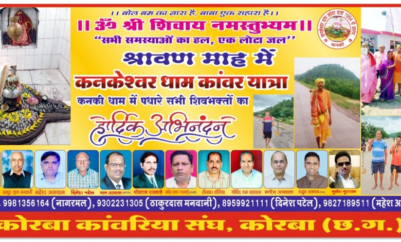 कोरबा। प्रत्येक वर्ष की भांति इस बार भी कोरबा कांवड़िया संघ के द्वारा विशाल भंडारे और कावड़ यात्रा का आयोजन किया जा रहा हैं, यह कावड़ यात्रा माँ सर्वमंगला मंदिर के समीप हसदेव नदी के पवित्र घाट से शुरू होगी और कनकेश्वर धाम में भगवान शिव शंकर को पूरे भक्तिभाव के साथ जलाभिषेक अर्पित करेंगे।