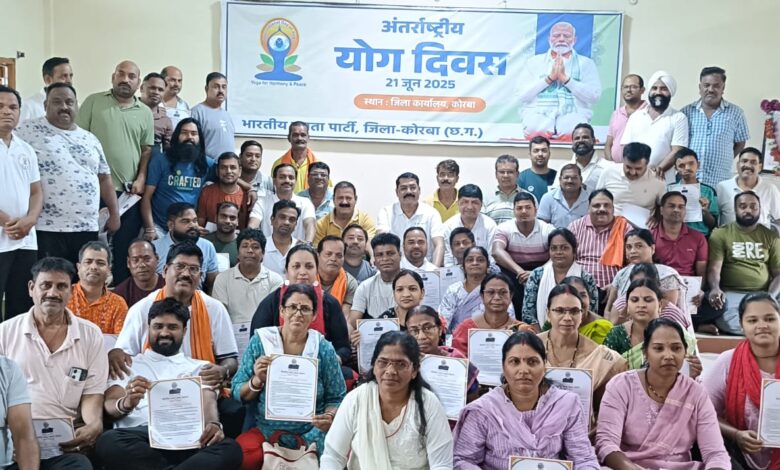 11 वां अंतर्राष्‍ट्रीय योग दिवस आज भाजपा जिला कार्यालय में उत्‍साहपूर्वक मनाया गया। 21 जून अंतरराष्ट्रीय योग दिवस के अवसर पर जिला भाजपा कार्यालय कोरबा में जिलाध्यक्ष गोपाल मोदी ने भाजपा कार्यकर्ताओ के साथ योगाभ्यास किया। साथ पूरे जिले में उनने नेतृत्व में भाजपा के तमाम पदाधिकारीयो और कार्यकर्ताओ ने पूरे उत्साह में योगाभ्यास किया। इस अवसर पर पूर्व महापौर जागेश लांबा, पूर्व नेताप्रतिपक्ष हितानंद अग्रवाल, लक्की नंदा, अजय चन्द्रा, परविंदर सिंह, योगेश मिश्रा, सूरज पांडेय सहित भाजपा के पदाधिकारी व कार्यकर्तागण उपस्थित रहें।